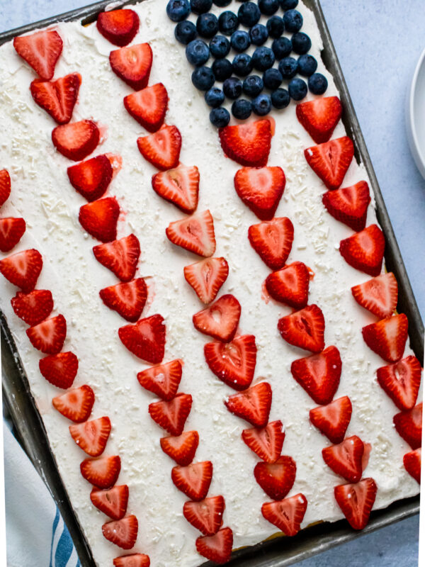 I remember my mom making a flag cake growing up, but I honestly don’t remember what kind of cake it was, I just remember the flag decoration on top like what I did. I decided to make a flag cake using a vanilla cake. I love that this cake is moist and light. I made it in a sheet cake, so it’s perfect for this cake. The cake is thinner than any other cake I make. I did this on purpose. In the summer most people don’t want a big piece of cake. If you don’t want to make the frosting you can always you coolwhip, that is delicious too.