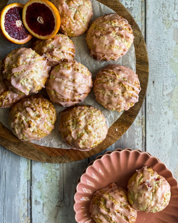 - Let scones cool before adding the glaze. Whisk powdered sugar and blood orange juice (1-2 oranges) Drizzle in top of scones.