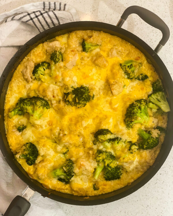 I used an ovenproof skillet. I used it to cook the chicken and make the sauce. After I made the sauce, I added the chicken, broccoli and rice, mixed it together, sprinkled some cheese and baked for 40 minutes with the lid on. I also used my favorite rice from Trader Joe’s to make this recipe easier. I used the frozen brown organic rice. Also you can make the rice ahead of time to save some time.