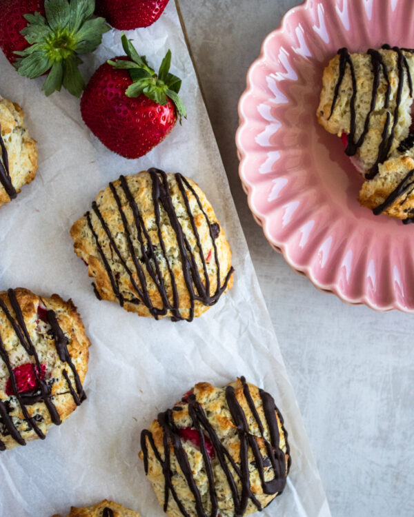 I like to freeze my butter and grate it in the mixture. You can also cubed the butter into the flour mixture. I used chopped chocolate but you can definitely use mini chocolate chips. If you are using frozen strawberries, defrost first and drain the juices from them.