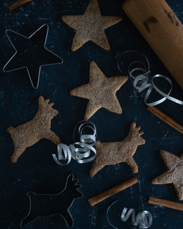 - Using a rolling pin, roll the dough in an even form. Use a star and a reindeer cutter to cut out. Place cutout cookies on a parchment lined baking sheet. Place cookies in the refrigerator for 10 minutes. This helps them from spreading.