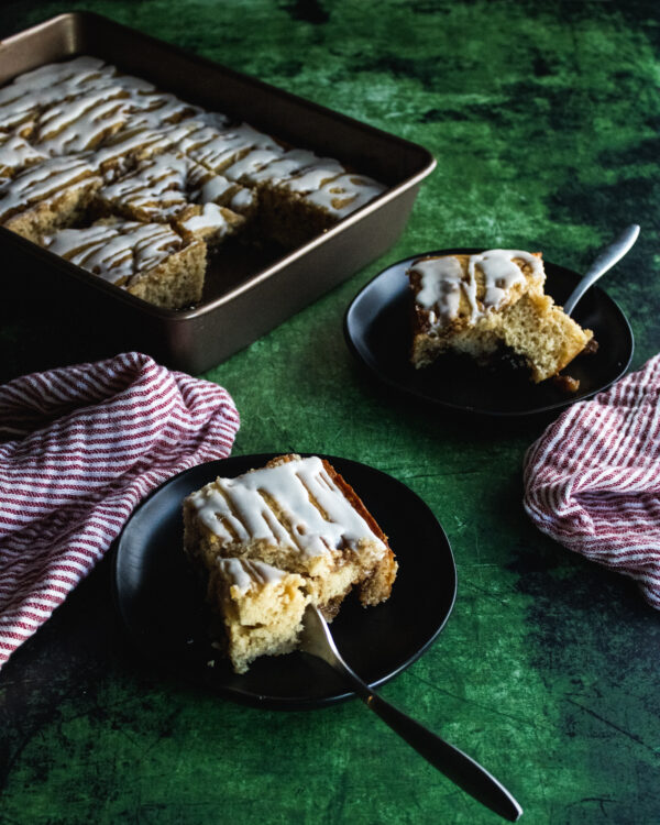 Make the cinnamon filling first and just set it aside. Make sure not to over mix the cake. There might still be a few lumps in the cake when you mix it. That is okay. When you add the cinnamon filling you will swirl it and mix it a little bit more. This cake is a lighter cake, not super heavy.