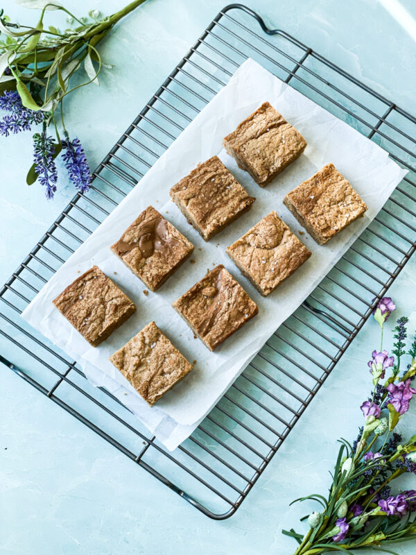 - Place the dough in the bottom of the prepared pan. Take the remaining ½ cup cookie butter and make dollops on top of the dough. Take a knife and swirl the cookie butter through the dough.