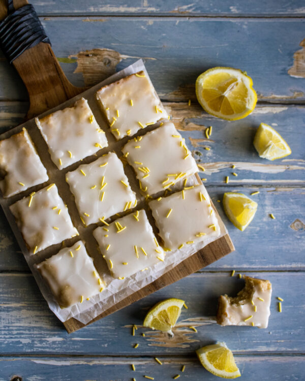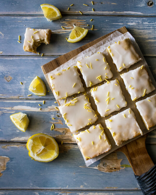 I have been working on recipes for the kids. Because when they move here, I will be packing their lunches and will need after school snacks. The kids love lemons, like the two oldest ones love to eat them. The youngest two love to put lemon in their water like I do. So I decided to make lemon bars. These bars aren’t your traditional lemon bars. They are a take on my almond meltaway cookies. So if you love those cookies, you will love these bar cookies. I am not a huge lemon person, but these bars are absolutely amazing. They are a soft cookie bar with lemon flavor and that lemon glaze poured over top just is perfect. Can you say yum?