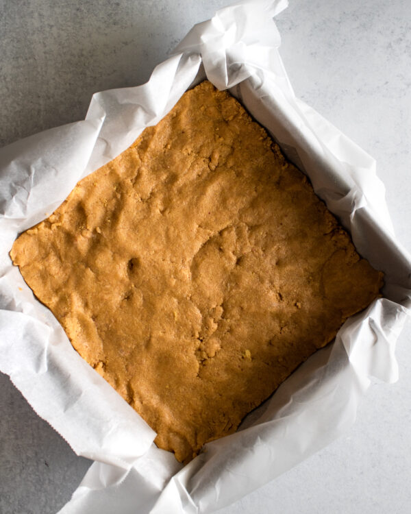 - Preheat the oven to 350. Line a 9×9 pan with parchment paper and set aside.