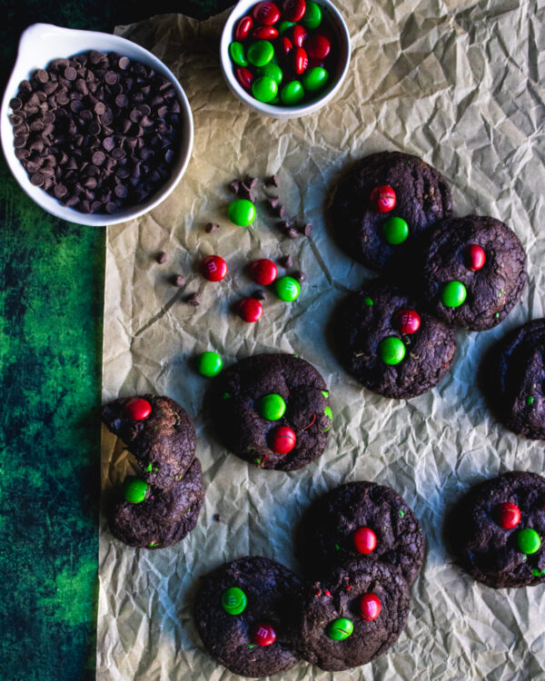 We are kicking off Christmas Cookie season with MM Brownie Cookies. Just think brownies and chocolate cookies collide. These cookies are so soft and so chocolatey. I added some MM’s to add a little crunch, color and more chocolate.
