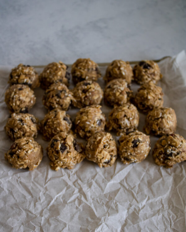 - Using a small scoop, scoop dough onto the prepared cookie sheet, place about 2” apart.