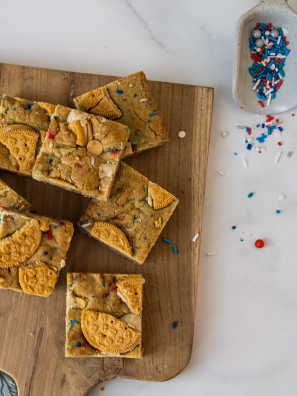 I prefer the vanilla Jo Jo’s from Trader Joes. Trust me once you try them you will be hooked. Use your favorite sprinkles, I used red, white and blue for Summer Holidays. You can also use chocolate chips instead of white, I just did this a non chocolate blondie.