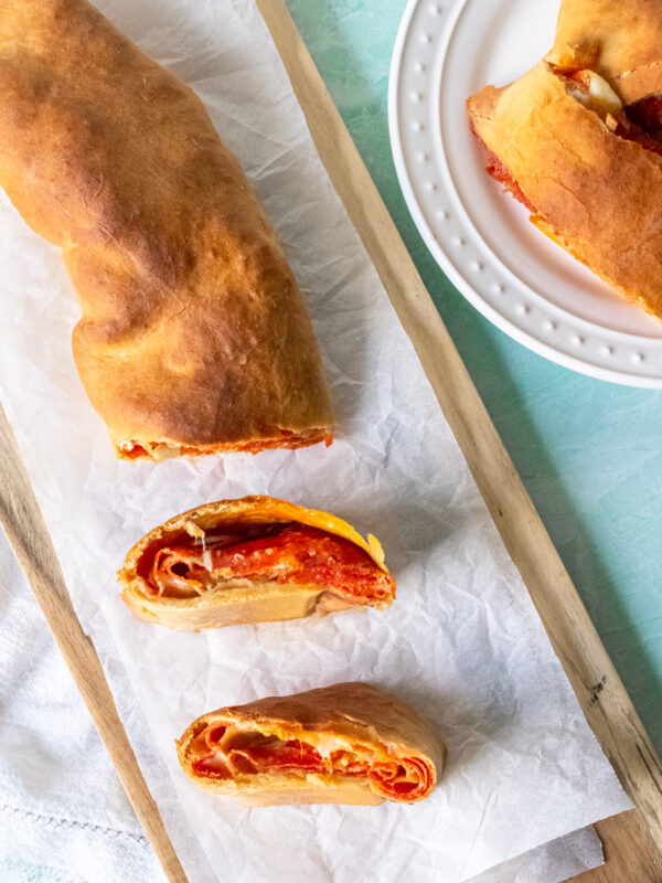 You can use a refrigerated pizza crust, I prefer the way the frozen bread bake and it works better. But in a pinch I will use a pizza crust. Also if your grocery store doesn’t have Rhodes, look for another brand. I know when I lived in NJ, I used a different brand. Make sure to get the pepperoni and cheese sliced a little thinner than normal. I always bake mine on a stone, bake time might be a little different with a cooking sheet.