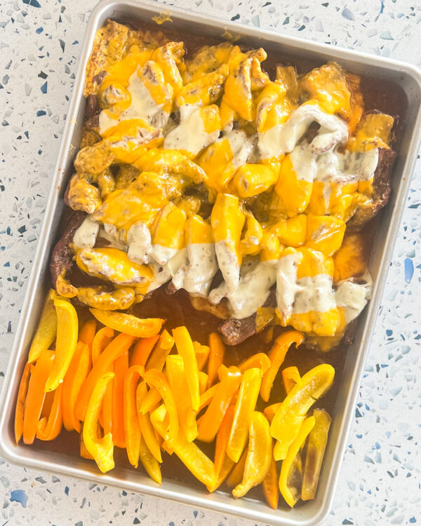 Make sure to slice the meat thin, so it is similar to Philly cheesesteak meat. You can use whatever cheese you want, but I highly recommend Tillamook cheese.