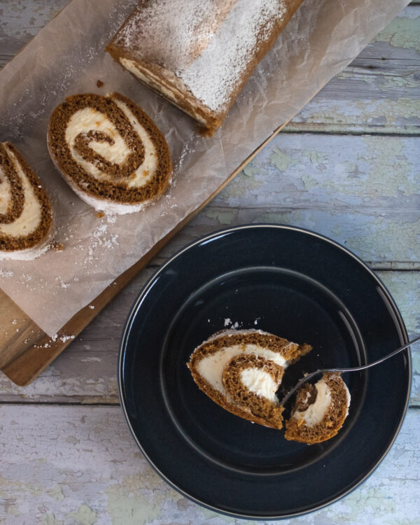 While the cake is cooling, make the cream cheese filling. To assemble the cake, carefully unroll the cooled cake. Spread an even layer of the cream cheese frosting. Carefully roll the cake back up and place in the refrigerator until ready to serve.