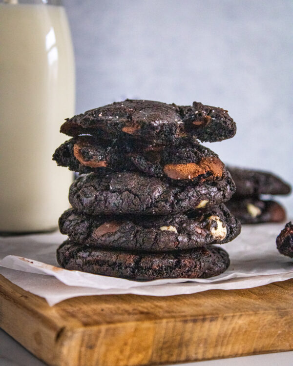 You can substitute dark cocoa for black cocoa. Honestly I really only use black cocoa. It has been a game changer for my baking. I did 2 different kinds of cacao. One one 60% and the other was a little bit more bittersweet. I went with 2 not super sweet to balance out the cookie dough and the white chocolate chips. Feel free to play with different chips.